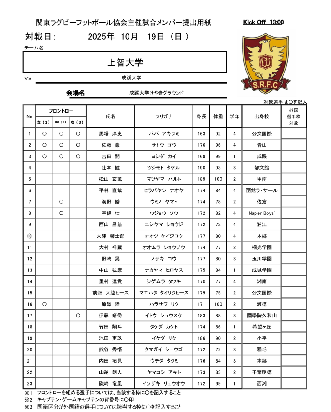 成蹊大学戦メンバー表